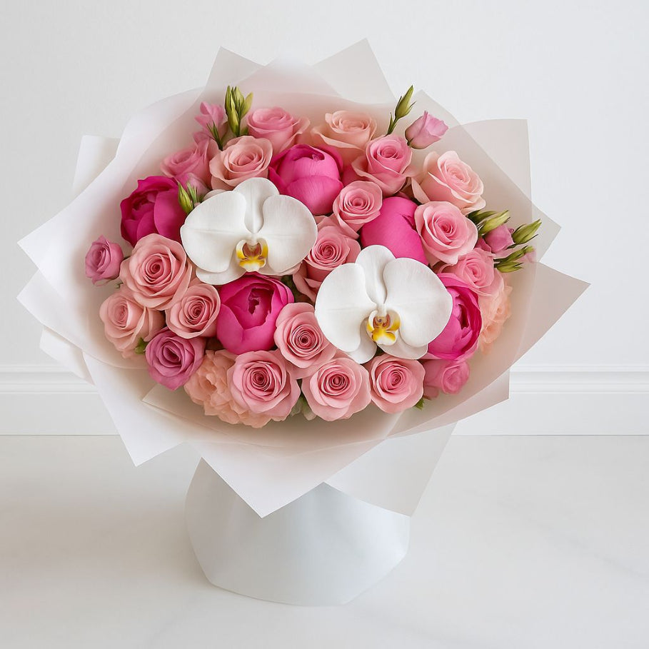 Bold yet graceful, Summer Romance features an exquisite mix of lush pink roses, delicate spray roses, and luxurious white Phalaenopsis orchids. Carefully wrapped. this bouquet is a true statement of elegance and affection—perfect for making any occasion unforgettable.
